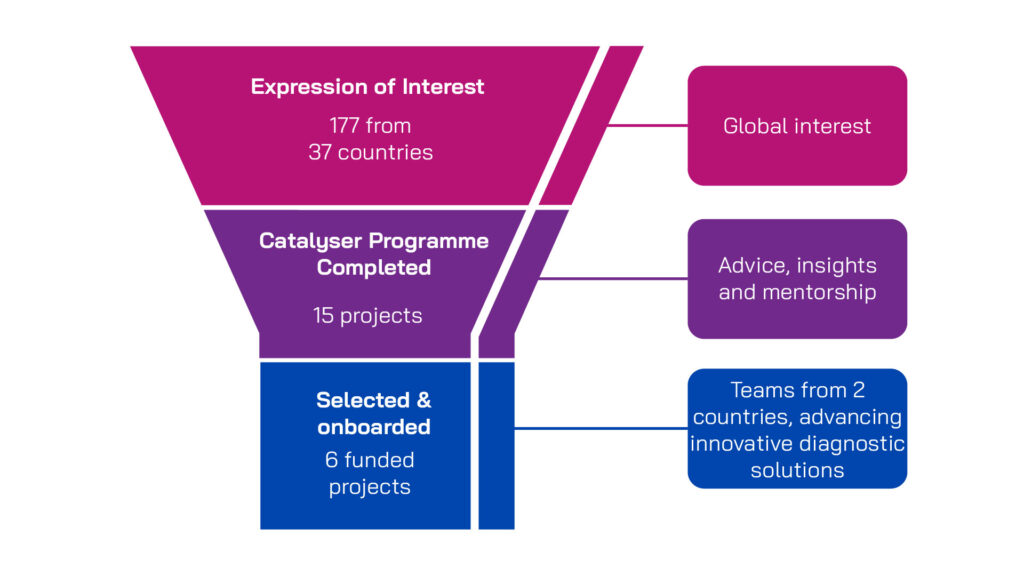 Fifteen Catalyser participants submitted full applications for funding and support. Final proposals were reviewed by an independent external Scientific Projects Advisory Group for diagnostic innovations and the AMR Community Representatives Committee – a committee of people who have been affected by AMR. Final funding decisions were made by the PACE joint programme management board, taking into account recommendations from the external expert panels, as well as considering strategic and portfolio fit. In total, six projects were selected, onboarded and welcomed into the PACE Portfolio.